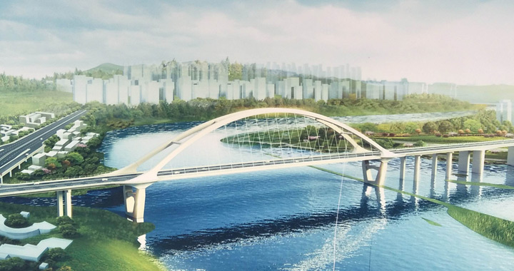 中壩州河大橋采用下沉式鋼箱提籃拱結(jié)構(gòu)型式,主橋長(zhǎng)為225米,全長(zhǎng)722米。拱頂?shù)綐蛎娴木嚯x為55米,主橋?qū)?5米,引橋?qū)?0米,道路連接線長(zhǎng)1700米,為城市主干道,是達(dá)州高新技術(shù)產(chǎn)業(yè)園區(qū)連接秦巴物流園區(qū)和馬踏洞新區(qū)的重要節(jié)點(diǎn)工程。